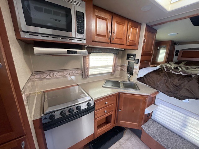 The corner kitchen includes a pantry, a three burner range, overhead cabinets and a corner angled double sink.
