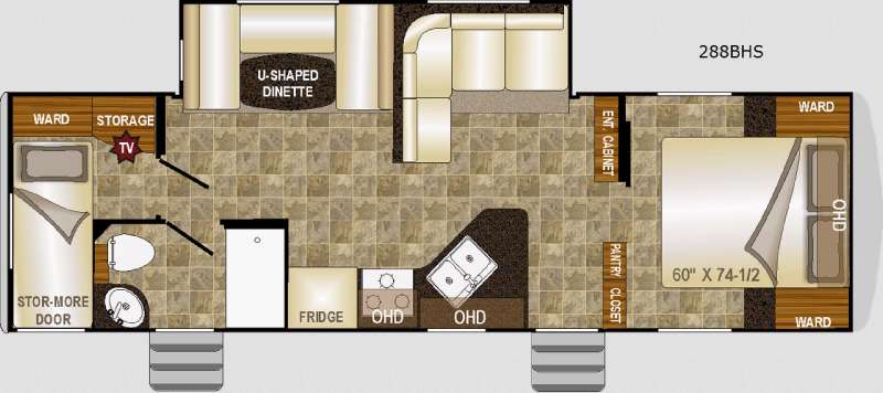 Northwood Mfg. offers the Snow River 288BHS travel trailer with a rear bunk house, a u-shaped dinette and a front bedroom.