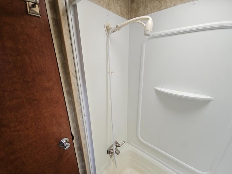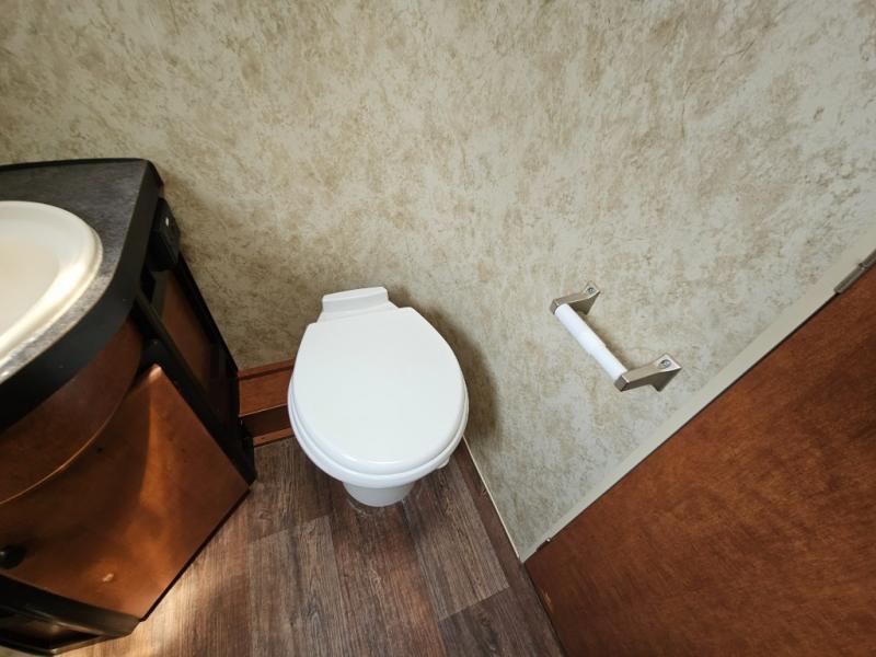Back out in the living area, a generous slide out includes an L-shaped sofa and a u-shaped dinette. There is an entertainment cabinet along the front wall that is shared with the bedroom for easy viewing from any seat.