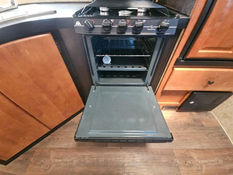 Opposite the slide out, the kitchen includes an angled double sink, overhead cabinets, a three burner stove, and a refrigerator.