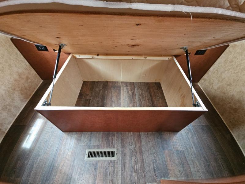 As you enter through the front door of this travel trailer, there is a pantry and a closet immediately on your right. Beyond them is a sliding door to the front bedroom. In the bedroom you will find a queen size bed, a wardrobe at each side of the bed and overhead cabinets.