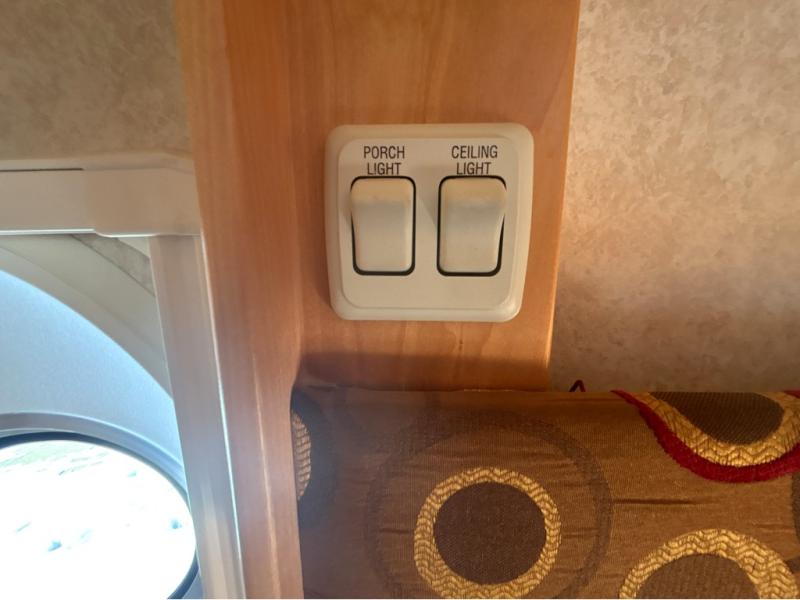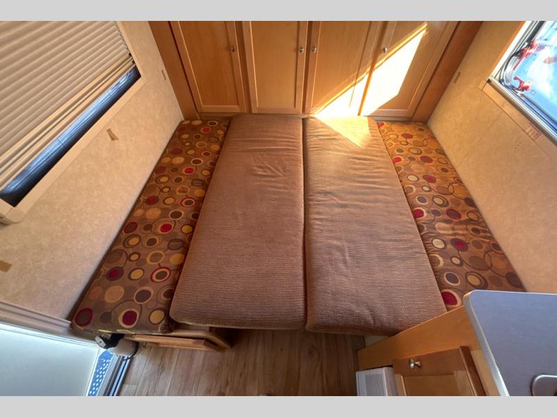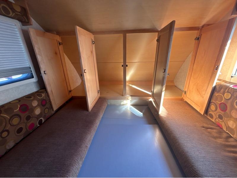 You will find ample seating with the u-shaped dinette space in back. There is overhead cabinets across the rear of the unit for your things, plus a wardrobe in the upper road side corner. There is also plenty of storage space beneath the dinette/bed seats as well.