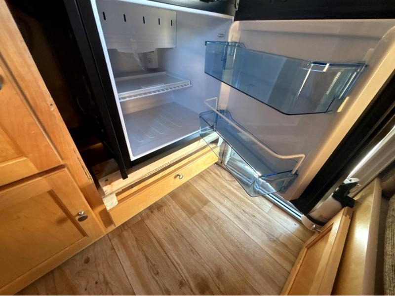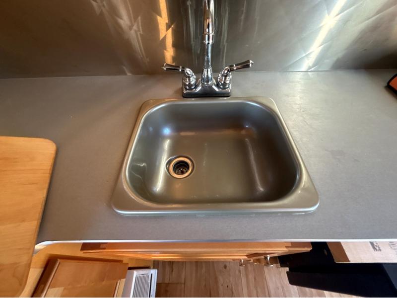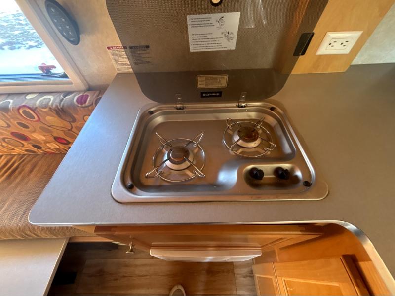 As you enter notice the front area for cooking. There is a two burner stove top, plus a single sink for cleaning up.There is also a 3-way refrigerator beneath the counter.