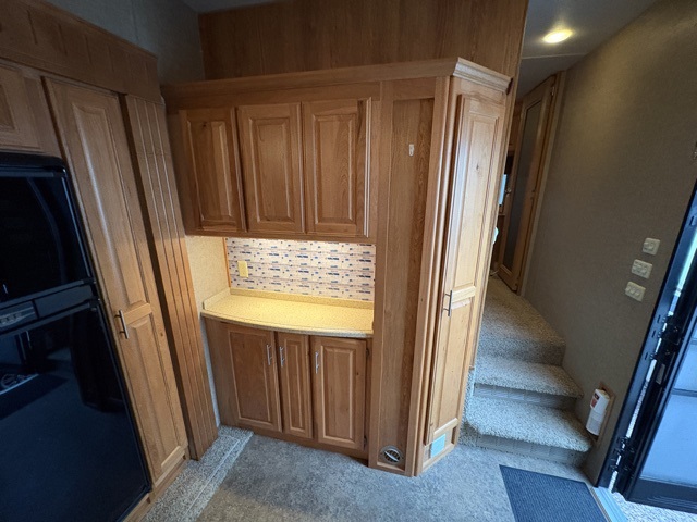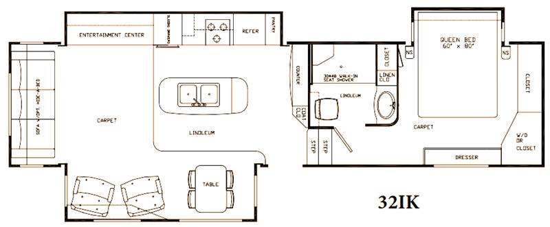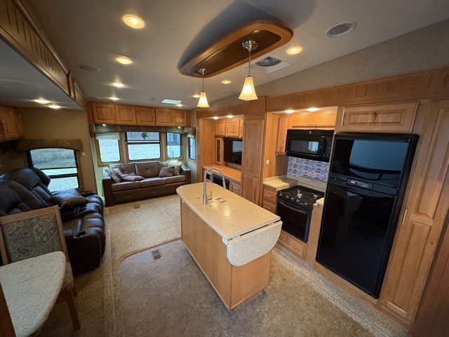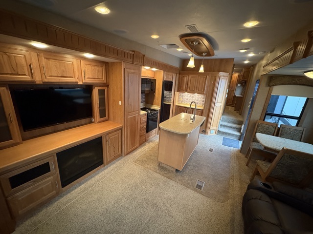 Along the interior living area wall straight in from the entry door is a counter with more storage below, and a coat closet to the left of the steps that lead up front. You will also enjoy the kitchen island for added counter prep space and it features a double sink.