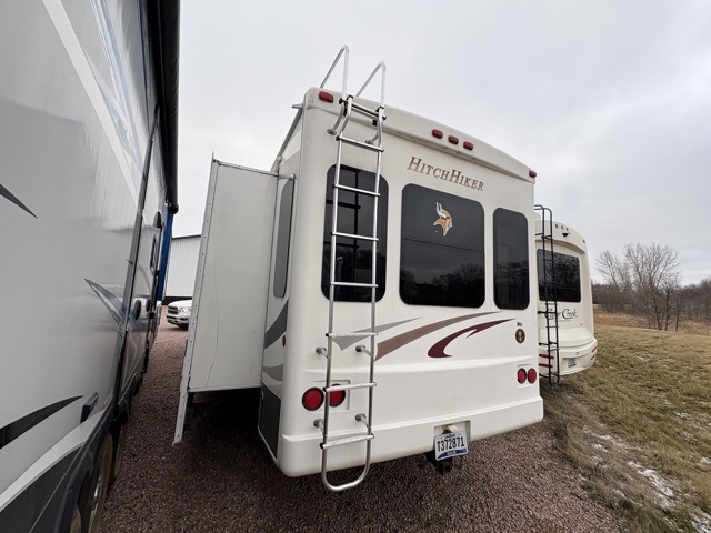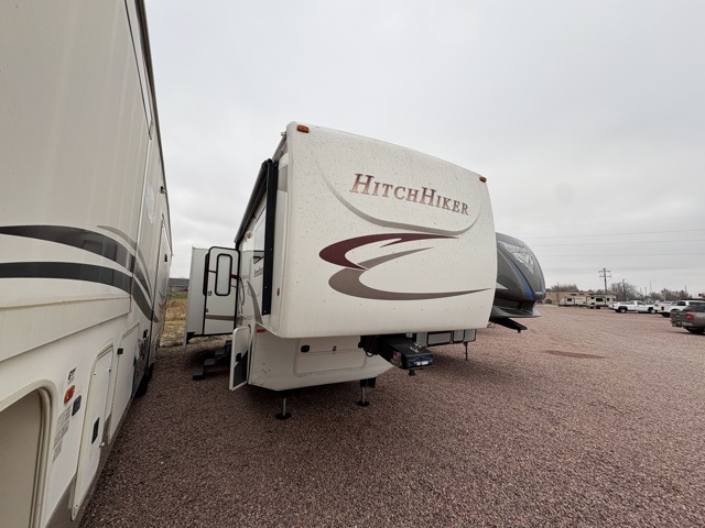 This NuWa HitchHiker fifth wheel model 32IK offers a rear living layout, triple slides for added space inside, and a convenient kitchen island, plus more!