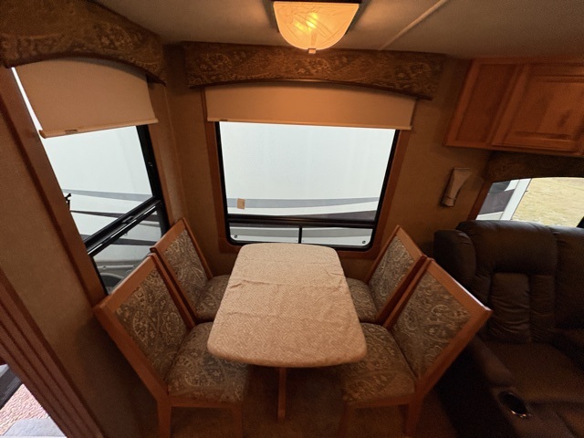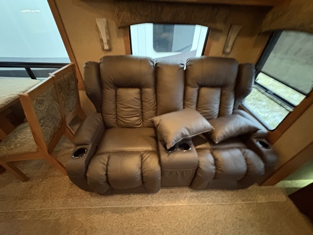 As you enter you will immediately feel the spaciousness in the living area due to opposite slide outs. There is a free standing dinette with four chairs and space for a theater seat to the left of the entry door. The floor plan here is shown with the optional reclining lounge chairs in place of the theater seating.