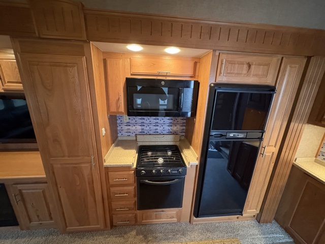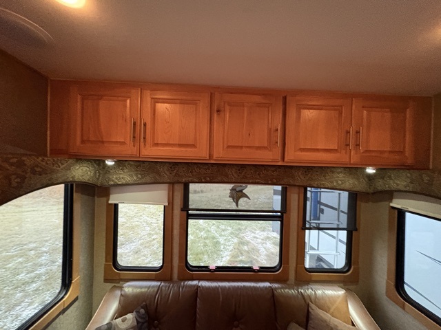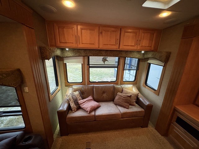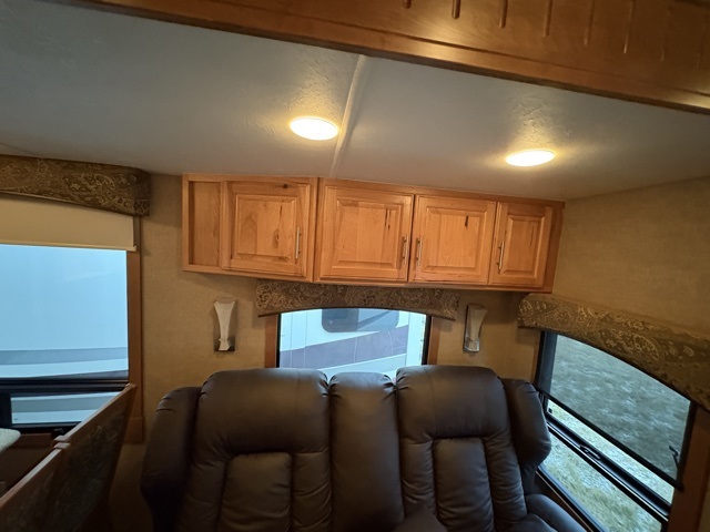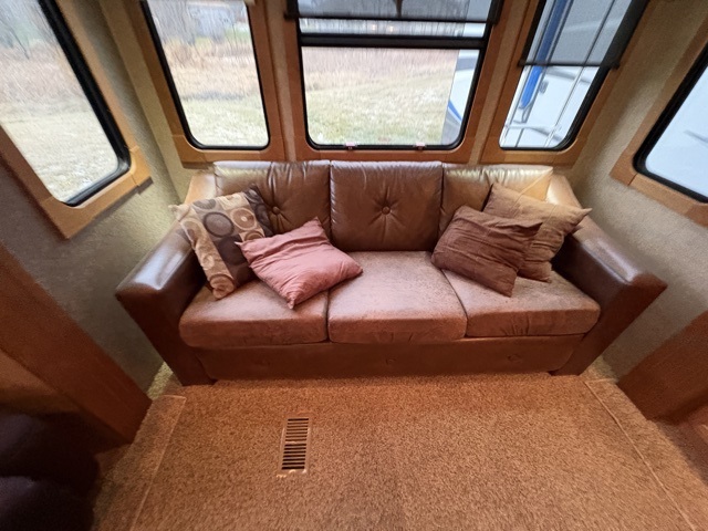 Along the rear wall find a sofa with optional hide-a-bed which provides seating during the day and extra sleeping space at night. A large entertainment center with 42" LED TV is adjacent to the sofa in the slide opposite the entry door. Within this slide you will also find a bank of storage drawers, a three burner range, refrigerator, and pantry.