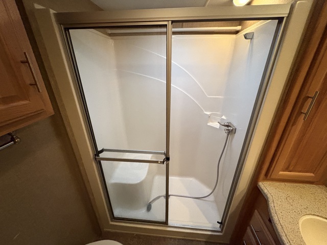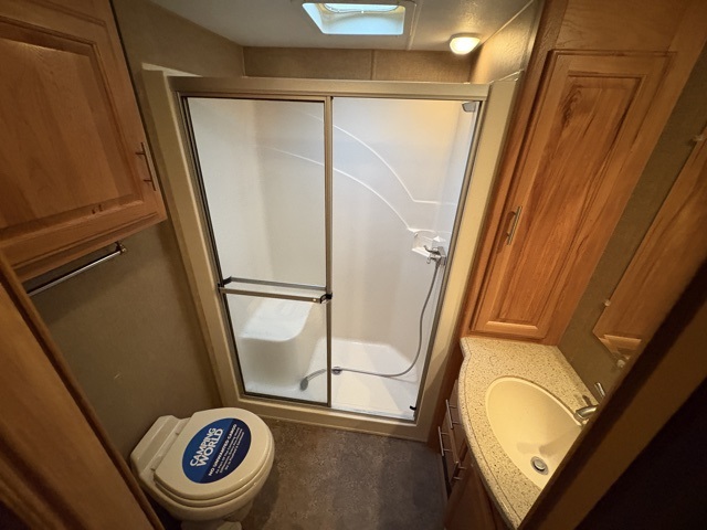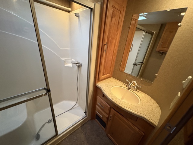Head up the steps to a side aisle bath and front master bedroom. The bath offers a toilet, sink, and 30" x 48" walk in shower, with storage.