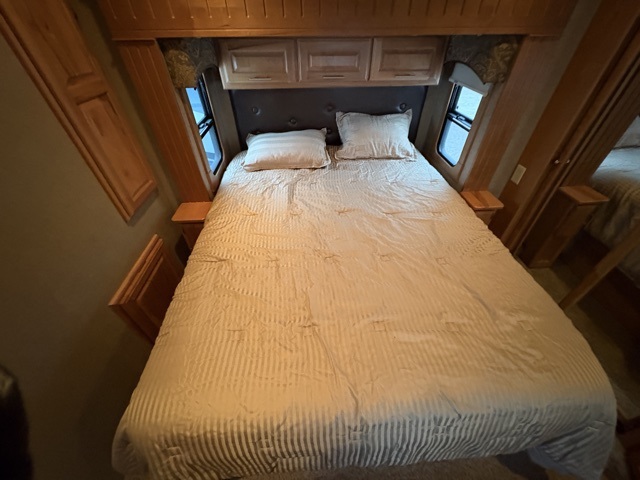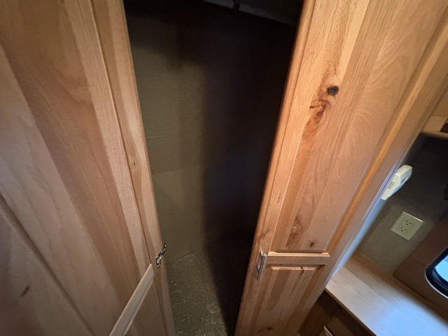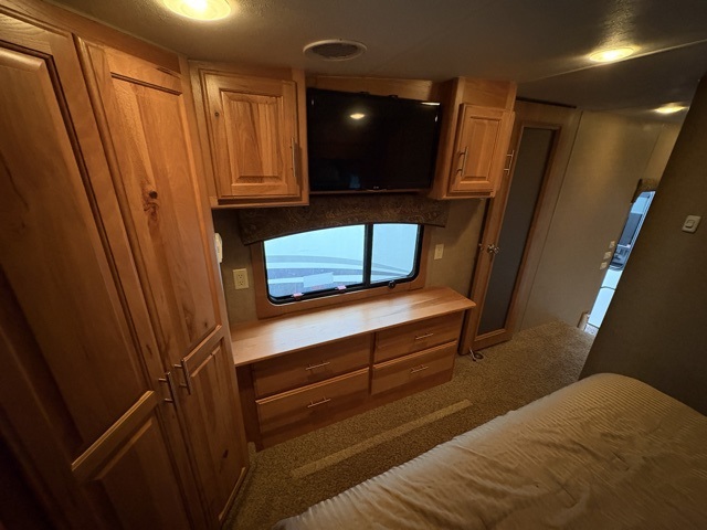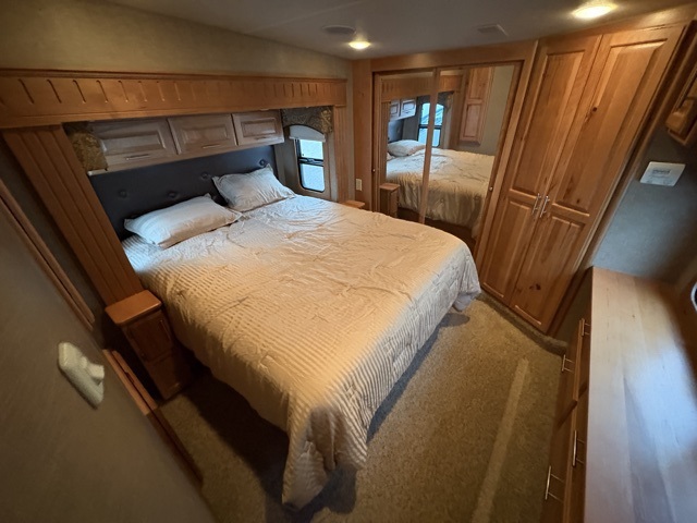 In the bedroom you will enjoy a restful nights sleep on the queen bed that slides out to provide a bit more foot traffic space. There are night stands on either side of the bed, plus a dresser opposite along the wall. Across the front find a closet with sliding doors, and a corner closet that has been prepped for a washer and dryer if you choose to add.