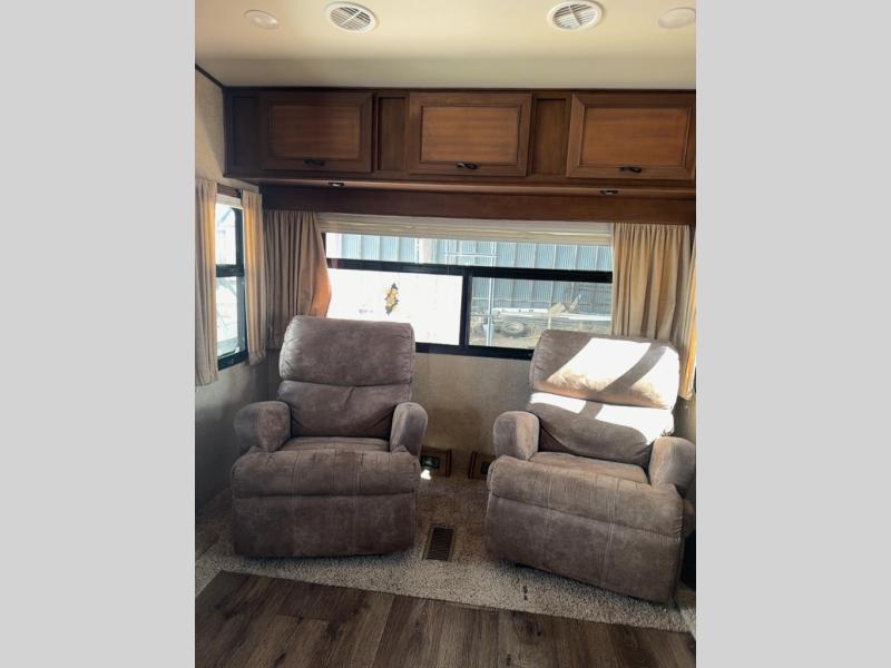 Back down at the main living space you will enjoy the open feel that the dual opposing slides create. The slide on the left passed the front entry door features a dining table with chairs, and an entertainment center. There are two recliners along the rear wall with an end table between, plus overhead storage the entire width of the unit.