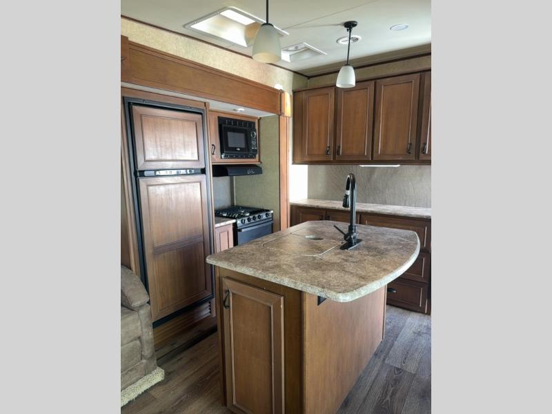 Step inside this Light fifth wheel model 318RLS by Open Range and see how easy it will be to enjoy every future camping trip you plan. This unit features a rear living layout, triple slides for added interior space, and a convenient kitchen island with optional bar stools and more.