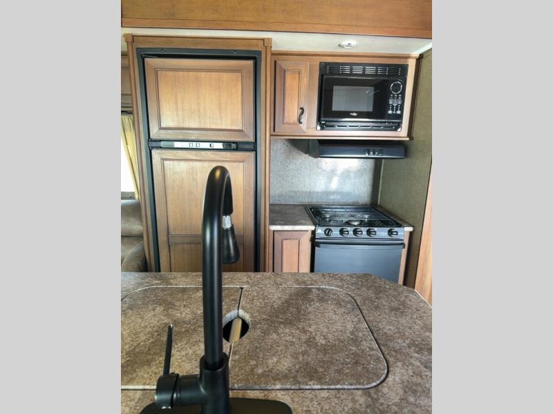 The second slide opposite the door offers a sofa with overhead cabinet, and kitchen amenities like a refrigerator and three burner range with microwave above. The kitchen island features a double sink with optional bar stools, and there is more overhead storage, counter space along the interior wall, and more!