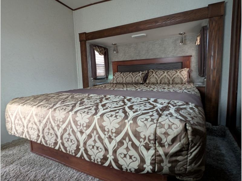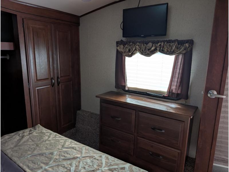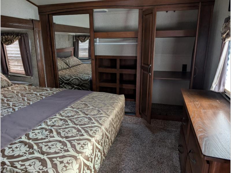 The front bedroom offers a quiet retreat including a slide out residential queen size bed with dual nightstands, a dresser opposite the bed, and full front wall wardrobe with washer and dryer prepped space in the corner including an overhead shelf, plus so much more!