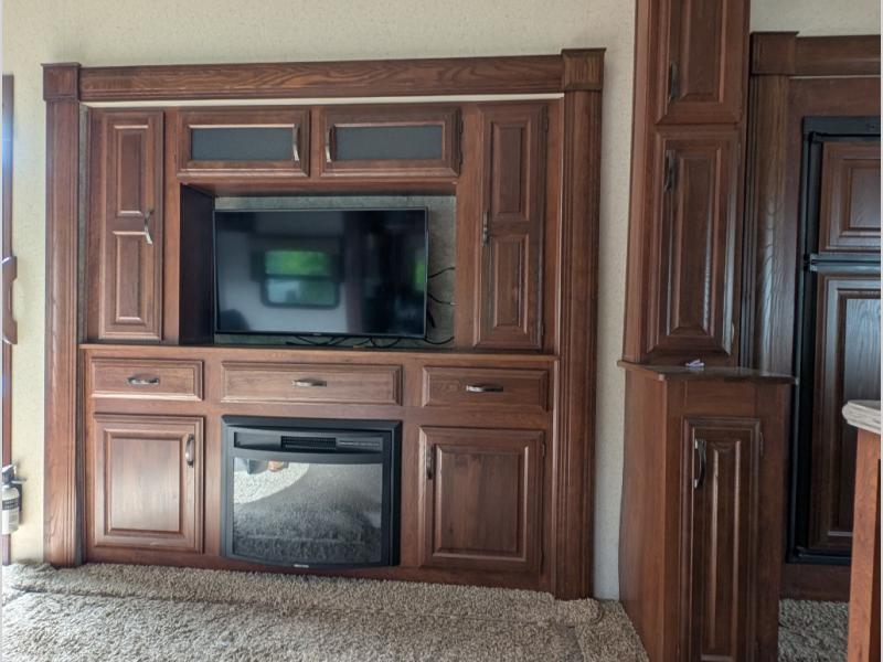 Step inside and notice the spacious room to your left. There are triple slides in this area alone. Starting with the slide out entertainment center including fireplace to your immediate left as you enter. On the back side of this slide enjoy an outdoor kitchen with refrigerator, counter space, and microwave oven.