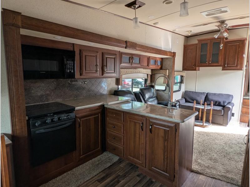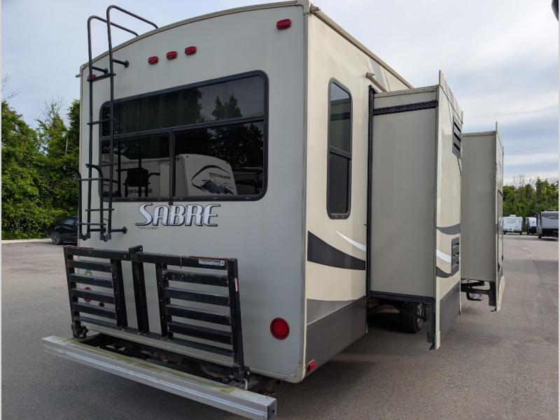 Camp comfortably in this Sabre fifth wheel model 34RDKS. This unit offers a rear spacious kitchen, quad slides throughout, and all the amenities needed to enjoy spending time away from home.
