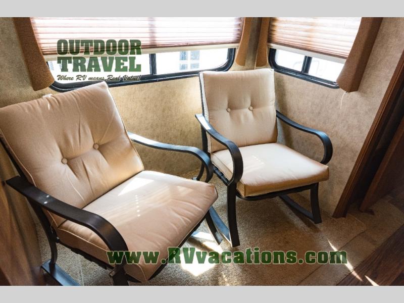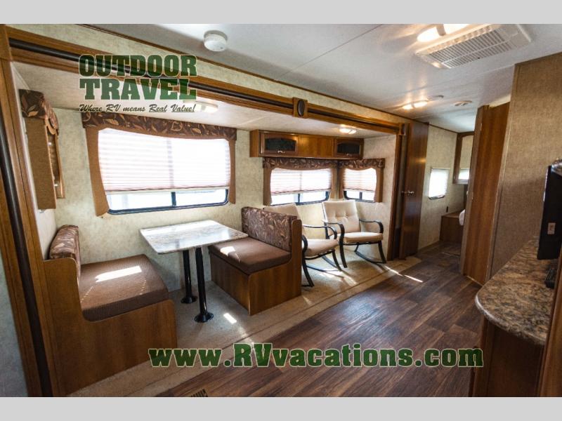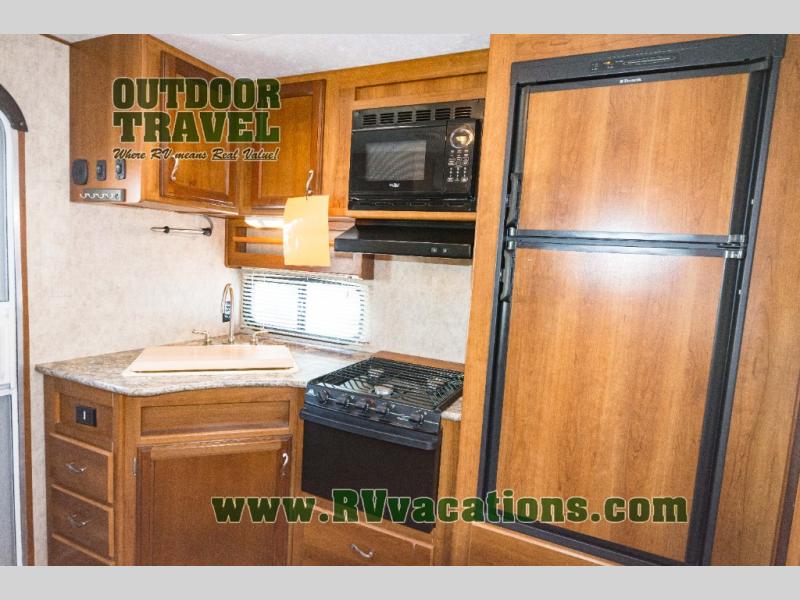 Stepping inside the Avenger 25RKS travel trailer by Prime Time Manufacturing, you will find that the kitchen is located in the rear. Along the rear wall there is a double kitchen sink, three burner range, and refrigerator. The slide has a dinette and a sofa. On the opposite side of the travel trailer you will find an entertainment center.