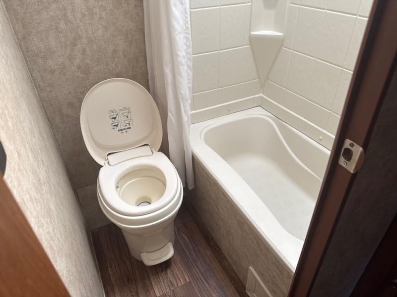 The bathroom has a tub and toilet and just outside of the bath area is a sink.