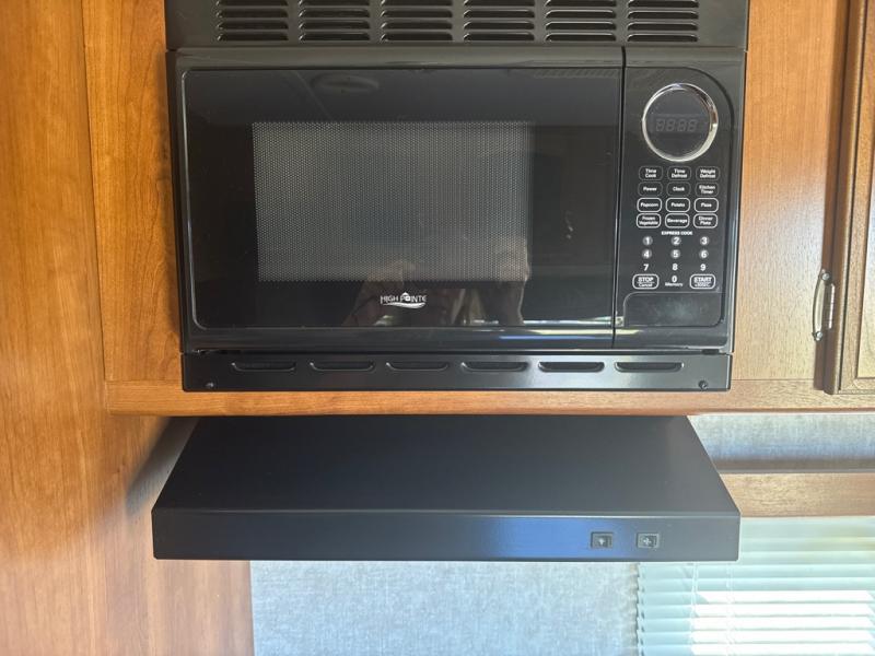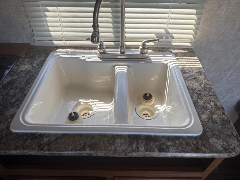 The kitchen and living area offer a sofa, double kitchen sink, three burner range, and refrigerator. The dinette is on the opposite side. You will find a spot for a TV/Radio above the dinette.