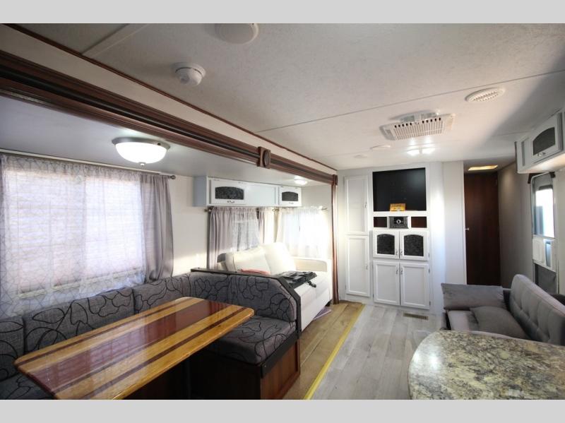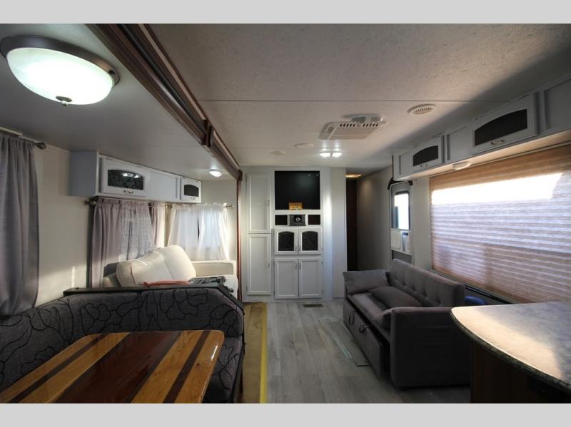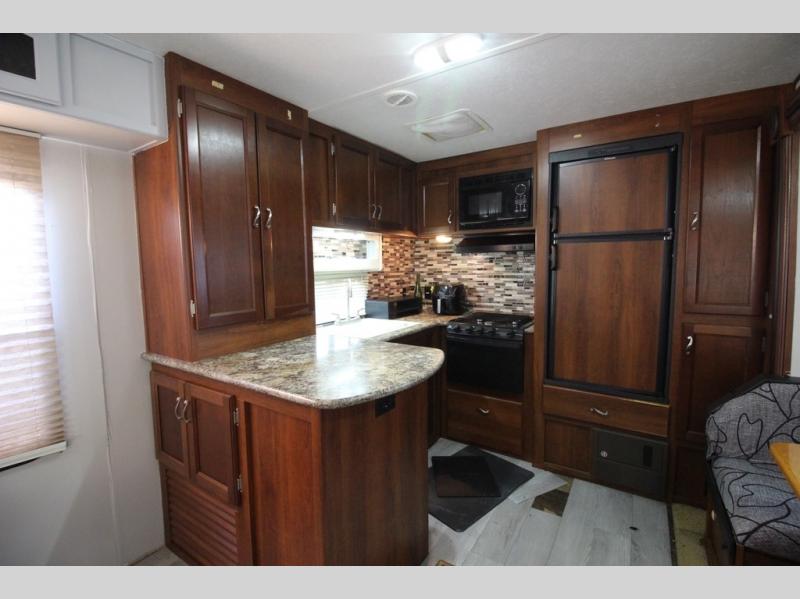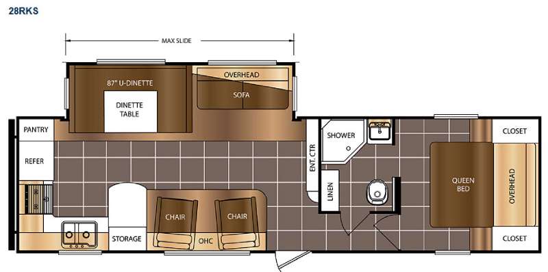 As you enter the 28RKS you will notice two lounge chairs to your left. There is a large counter space, double kitchen sink, three burner range, refrigerator, and pantry. The slide has a u-shaped dinette and sofa. Along one wall there is an entertainment center that you are sure to enjoy.