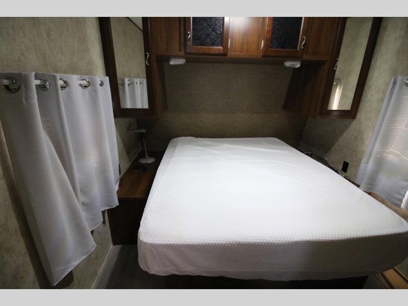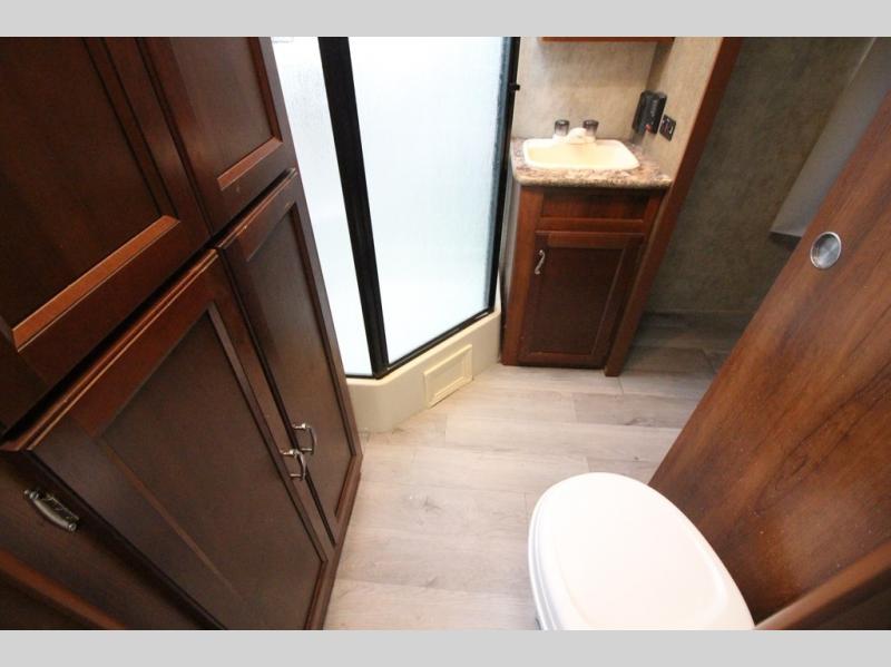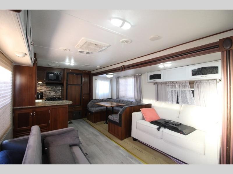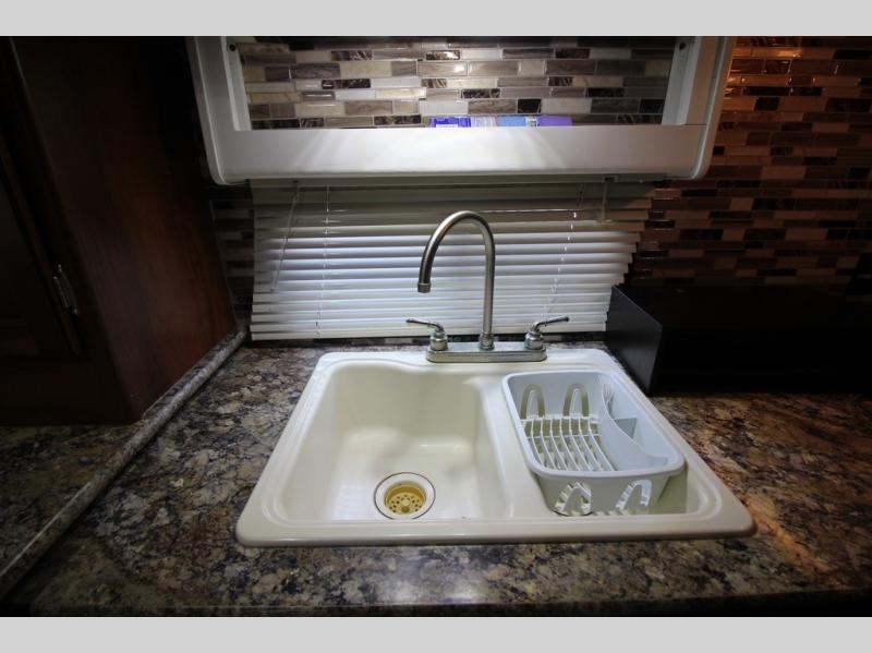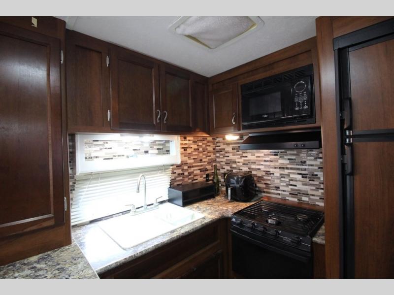 What I liked most: The kitchen area is very well placed in the corner with everything close by. The seating arrangements are good as the couches and chairs face each other for socializing. Having a full slide makes it feel that much bigger. There is a good amount of counter space on each side of the bed.