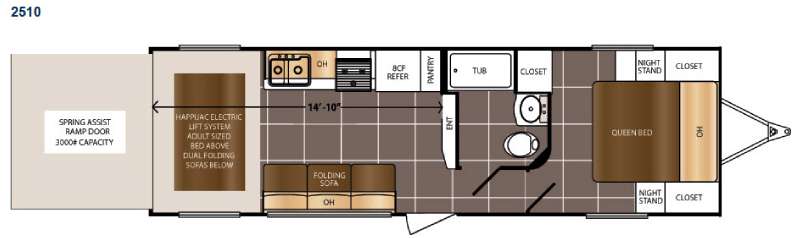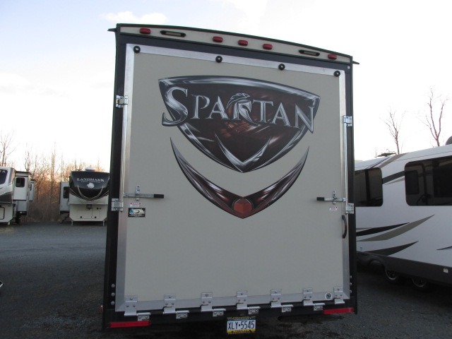 You will find that the Spartan 300 Series toy hauler travel trailer by Prime Time Manufacturing has a rear spring assist ramp door. In the cargo area there is a happijack electric lift system with a bed above and dual folding sofas below.