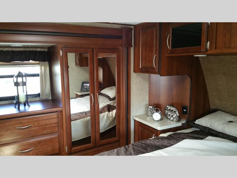 The front bedroom has a slide with two closets and a chest of drawer. There is also a queen bed with an overhead cabinet above the bed.
