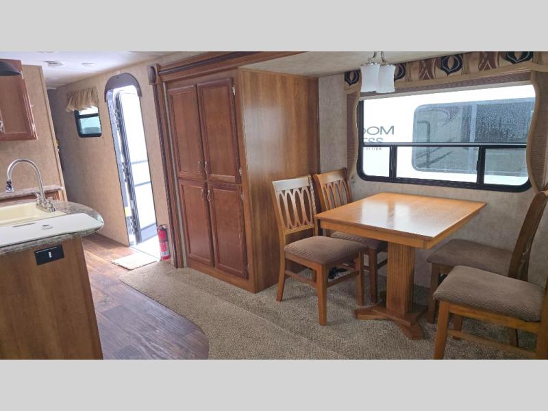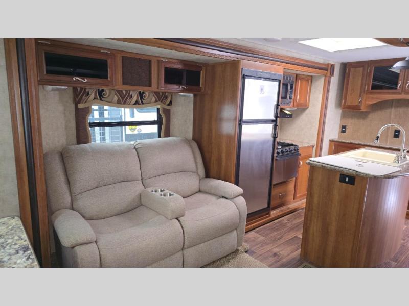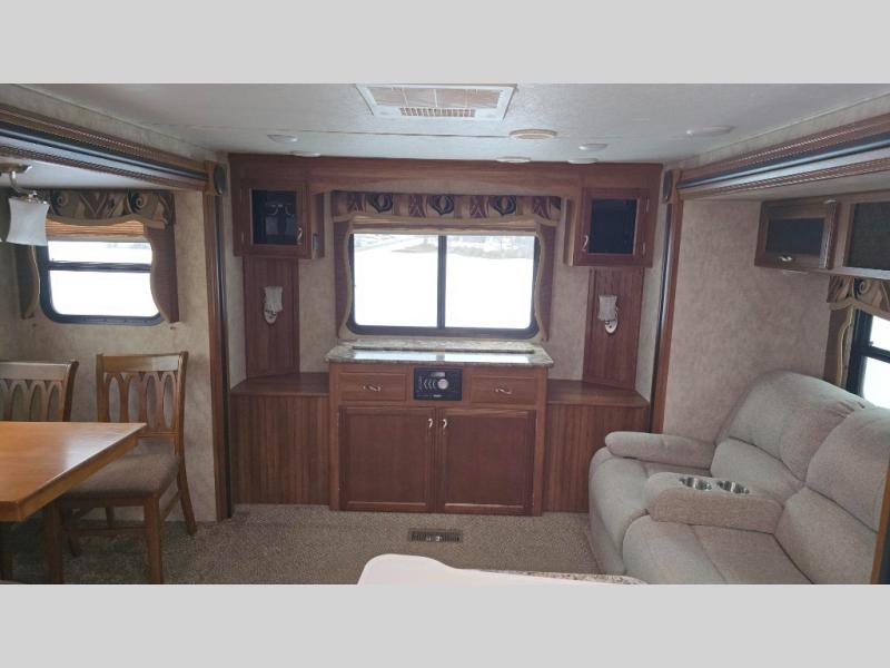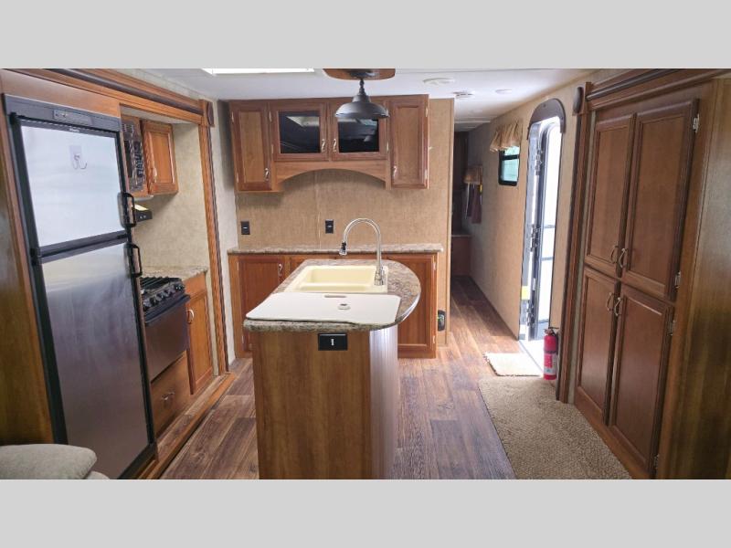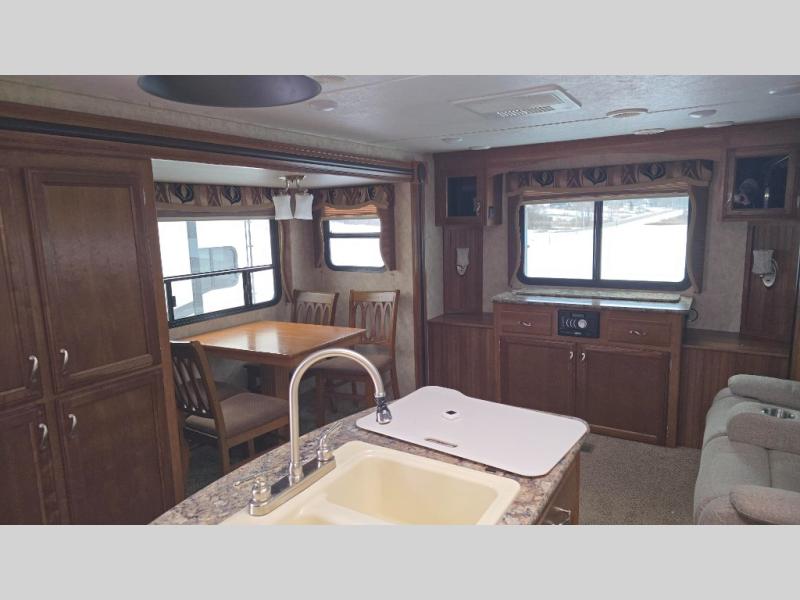 Stepping inside the travel trailer, to the left there is a slide with a pantry, and a free-standing dinette. On the opposite side you will find a slide with a hide-a-bed, refrigerator, and a three burner range. In the middle of the kitchen there is an island with a double kitchen sink. Along one side of the kitchen area there is a nice size hutch. Along the rear wall of the trailer you will find an entertainment center with an overhead cabinet.