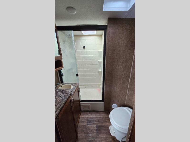 The side aisle bath has a sink, shower, and toilet.