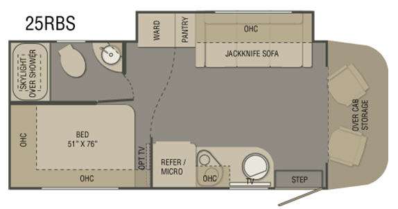 Directly across from the kitchen is a jackknife sofa with overhead cabinet slide out. You can choose a hide-a-bed sofa option instead. The slides also features a pantry for food storage, and a wardrobe for your clothing.