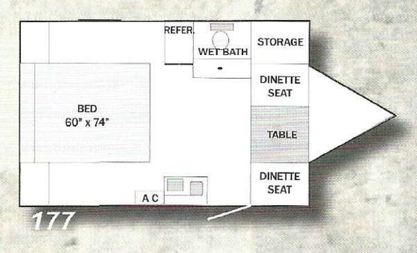 The Riverside RV White Water 177 Classic offers a walk around rear queen bed with nightstands and wardrobes along with overhead storage cabinets.