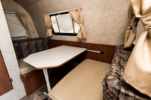 Across the front, there is a booth dinette with storage behind the seat furthest from the entry door. This storage area has access at the top inside and from an exterior side door as well.