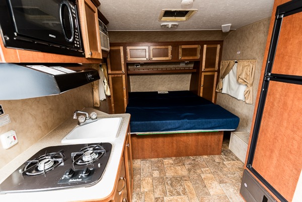 Along the entry wall, there is an AC unit and the kitchen amenities including a galley sink and a two burner stove top.