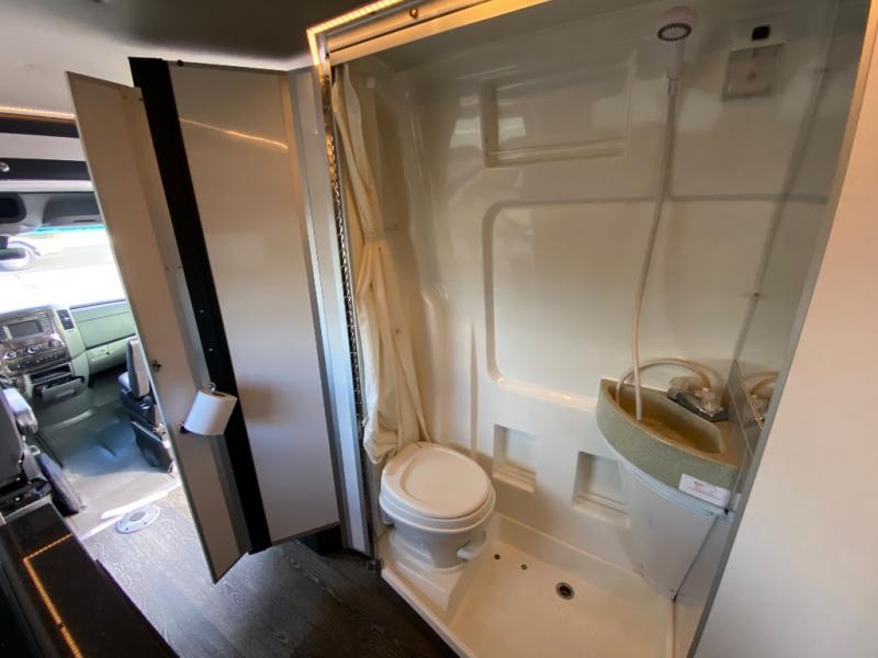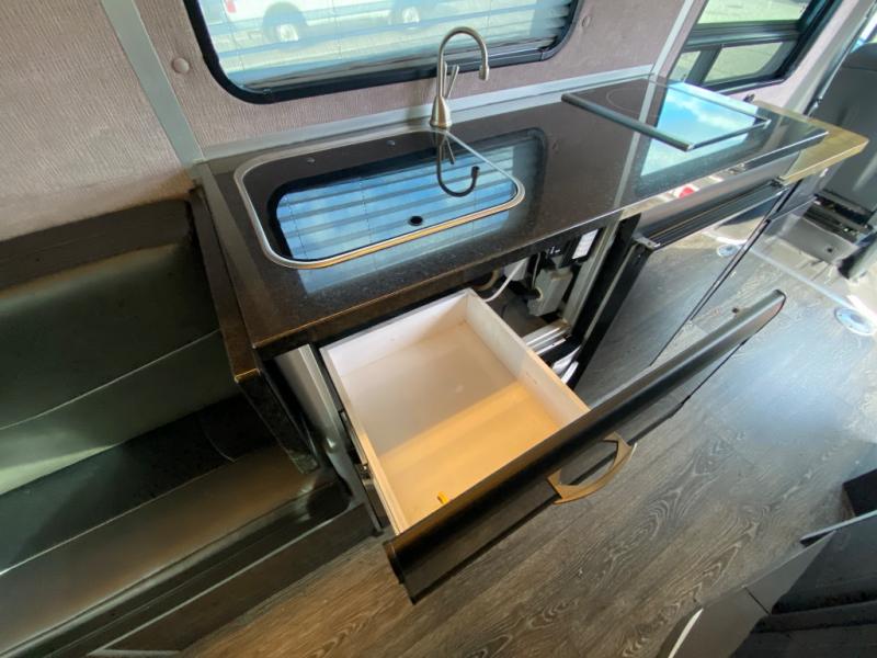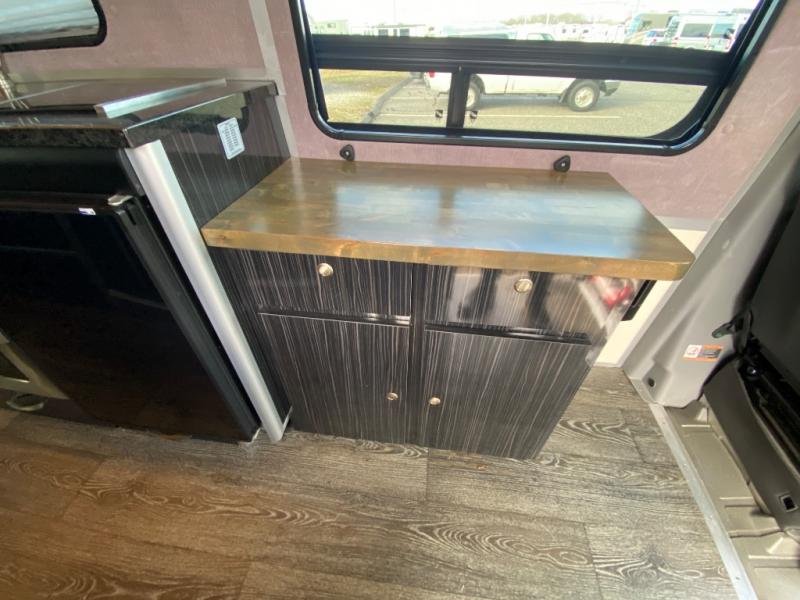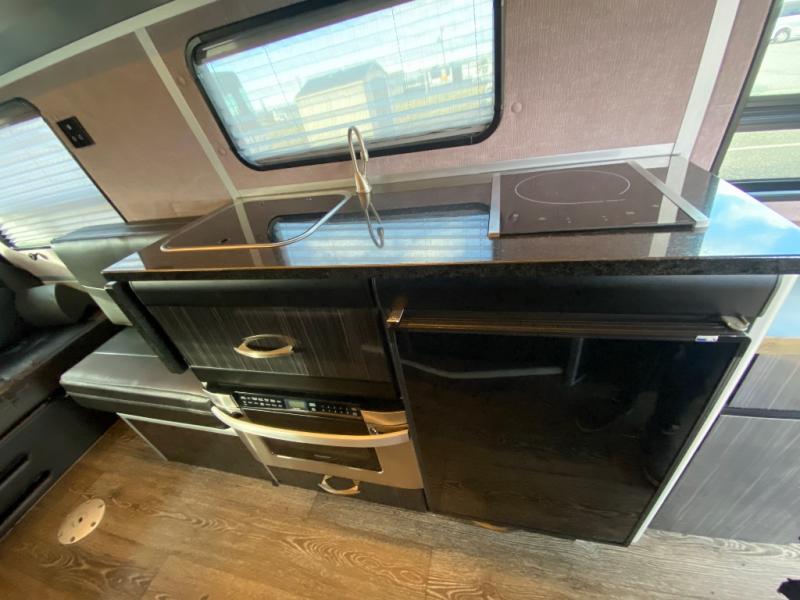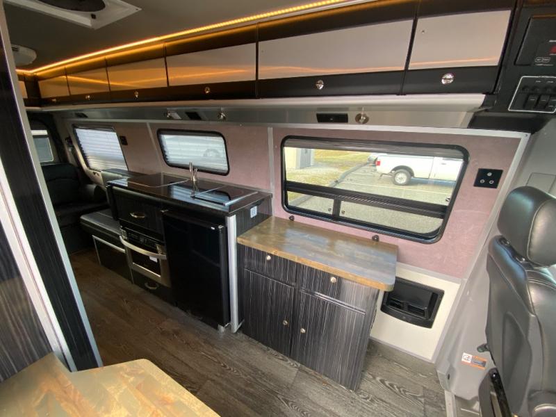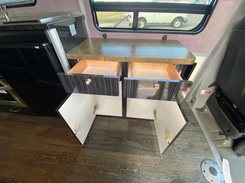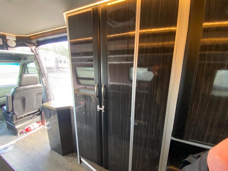 Along the passenger side of the van there is an enclosed toilet and sink. Continuing to the back there is a wardrobe. The driver's side of the coach features a single burner stove top, refrigerator, optional microwave, and single bowl sink, and more.
