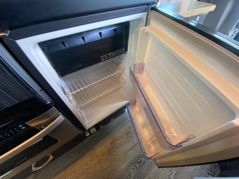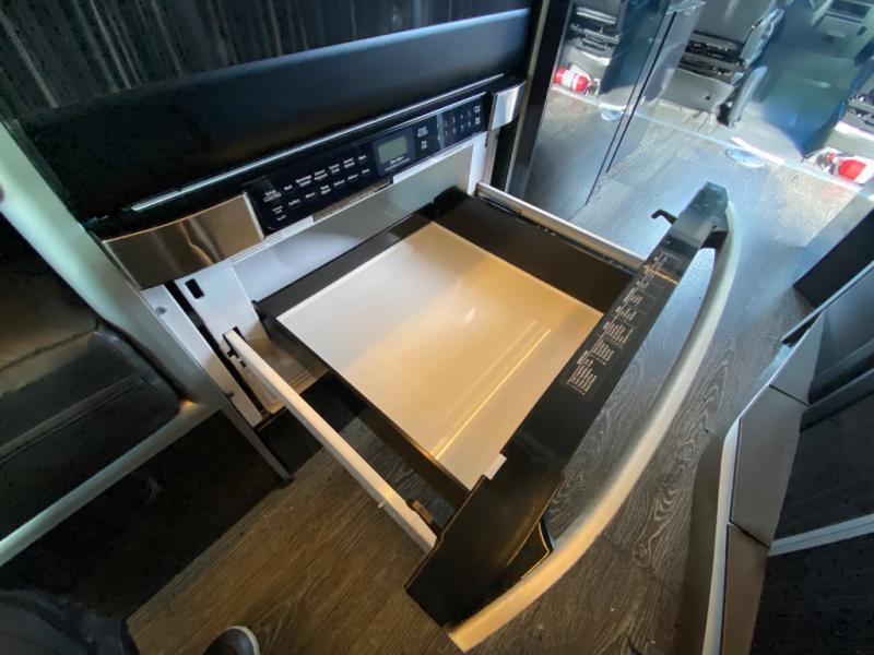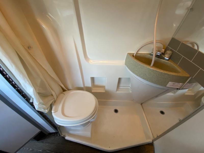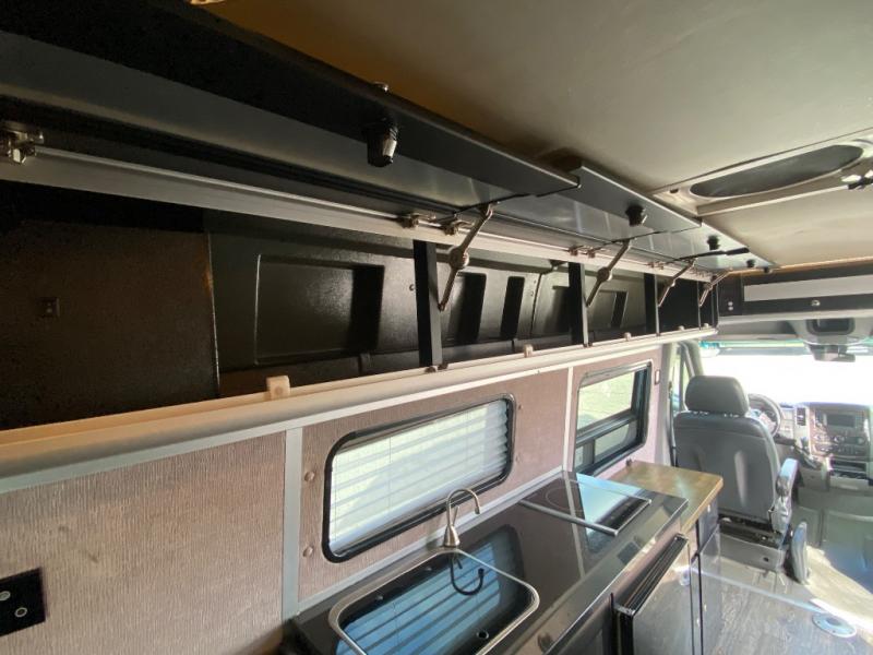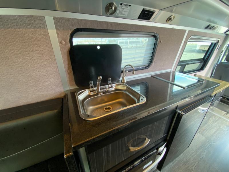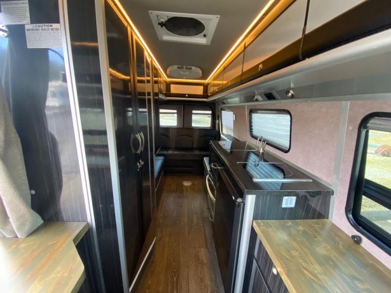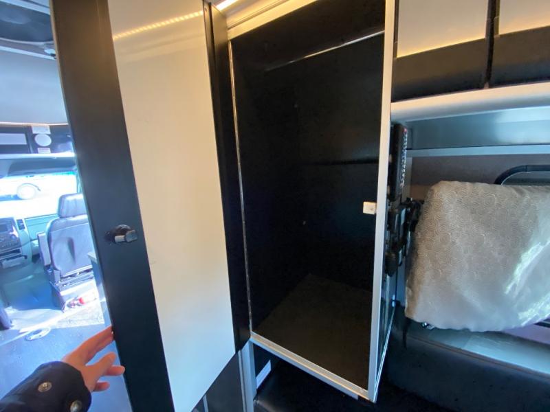Along the passenger side of the van there is an enclosed toilet and sink. Continuing to the back there is a wardrobe. The driver's side of the coach features a single burner stove top, refrigerator, optional microwave, and single bowl sink, and more.