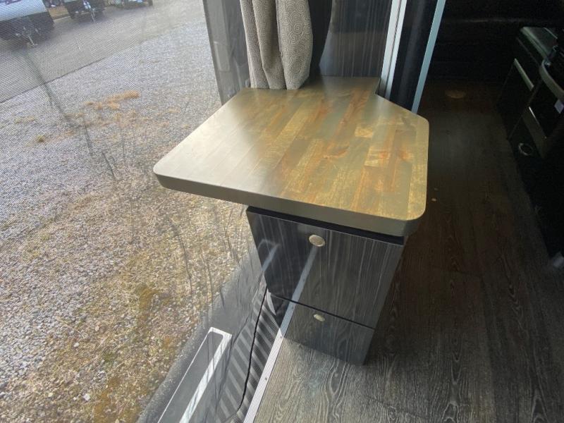 The front of the motorhome includes four captains chairs that swivel to sit around a front pedestal table. Optional folding mattresses can be added to the chairs on either or both sides to offer additional sleeping space.