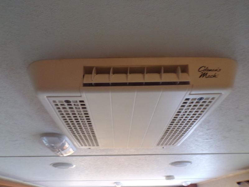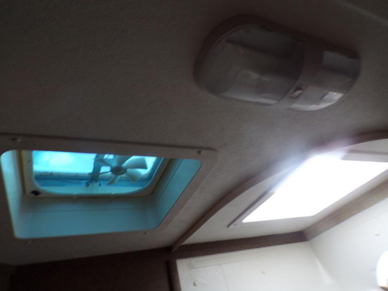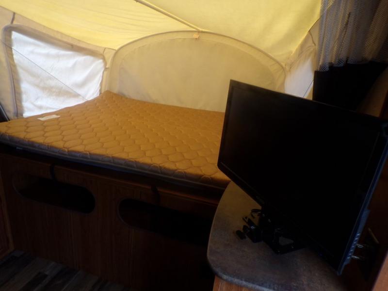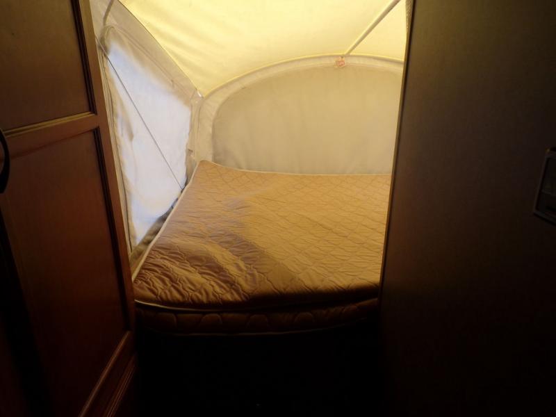 As you enter you will find a wardrobe to your immediate right that has a space above for a the TV. The front features an expandable queen size tent end bed with overhead shelf for storage, plus a nightstand opposite the wardrobe.