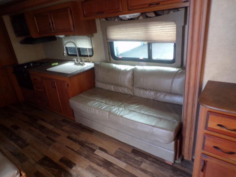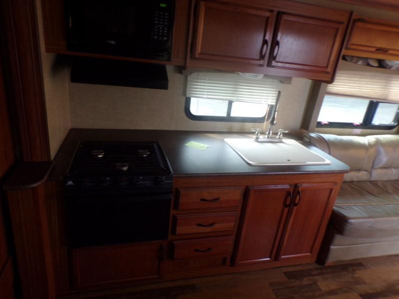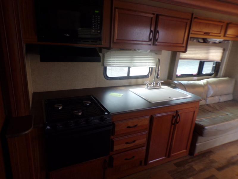 There is a slide out sofa with overhead cabinet space, a large sink, and a three burner range with microwave, plus a pantry nearby for dry goods and more.