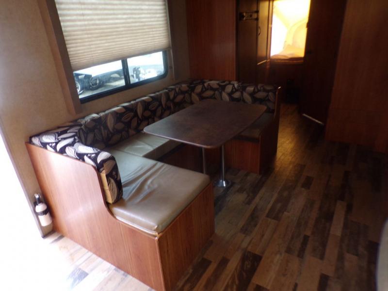 On the opposite side there is a u-shaped dinette for comfortable dining, playing board games, or just hanging out. Next to the dinette is the refrigerator, wardrobe, and a second pantry.