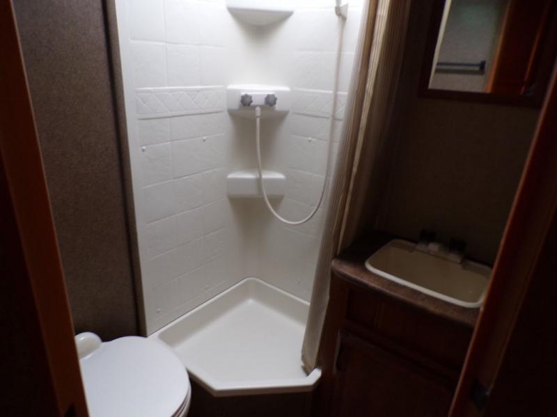 In the rear right corner there is a bathroom which features an angled shower, toilet and sink.