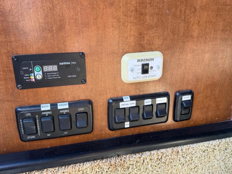 Back up front there is a coffee table between the two captain's chairs. If outside relaxing is something you enjoy, the 32" LED TV is located beside the entry door.