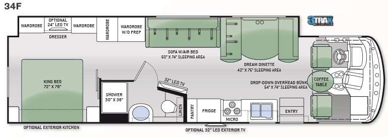 As you enter the Hurricane 34F class A gas motor home by Thor Motor Coach, you will notice a full wall slide out along the driver's side that opens up this whole motor home. Within the living area, it houses a dream dinette and a sofa with air bed along with overhead cabinets. Just beyond the sofa, there are two wardrobes, one that includes washer/dryer prep.