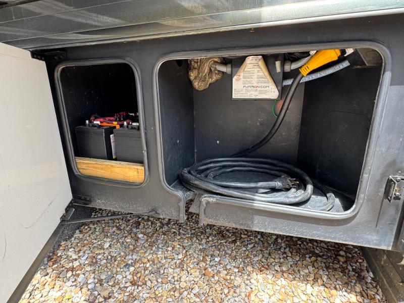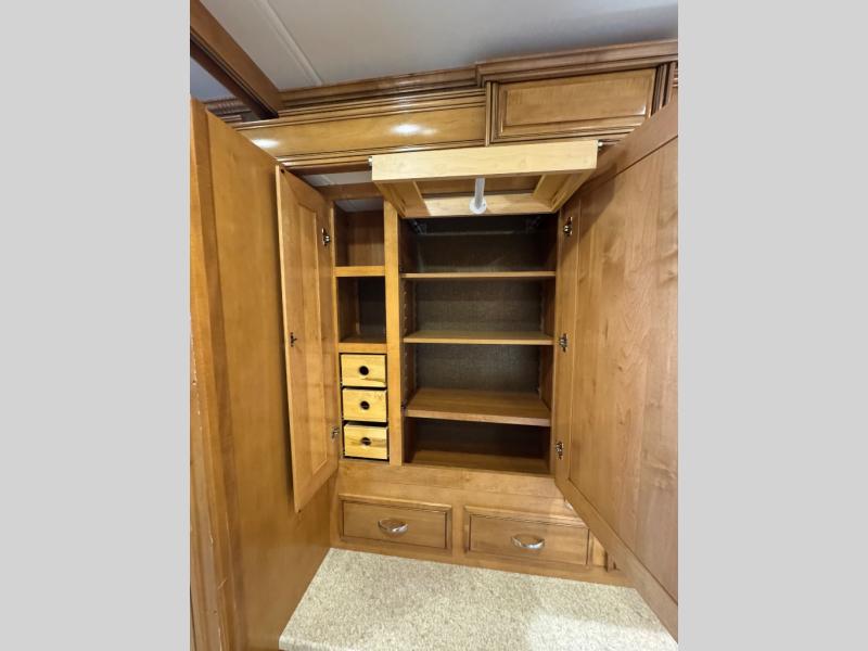 As you make your way toward the rear pass through the sliding door that separates the living space from the master bedroom suite. Here you will find a king size bed with nightstands that is within a slide out that also features the rear bath toilet and sink. Opposite the bed is a dresser and 32" LED HDTV and closet that is part of the large curb side slide out opposite.