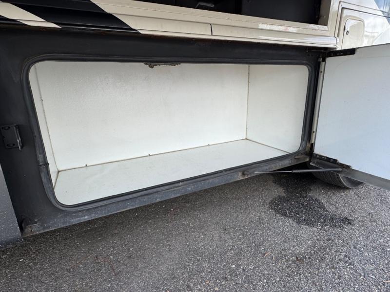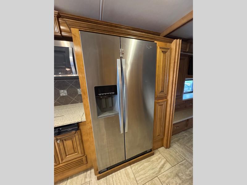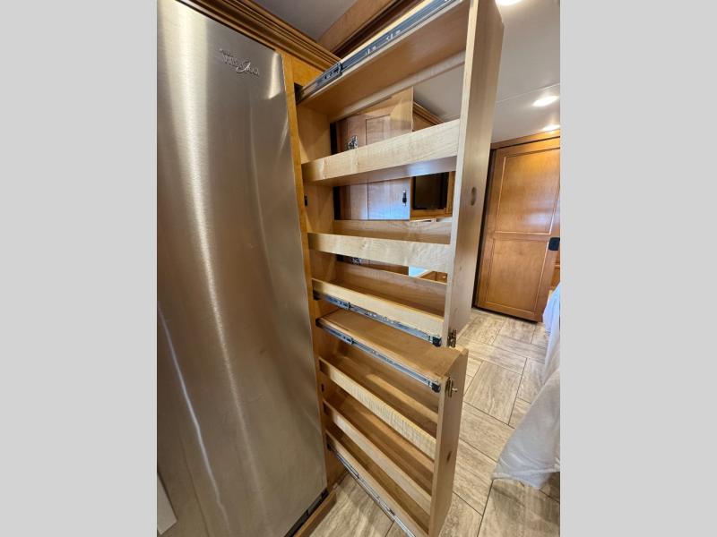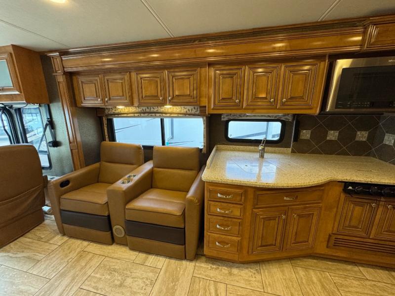 As you enter in front of the passenger seat you will be amazed when you look to the rear of the coach at the space inside with the living area slides fully expanded. There is a large slide along the entire curb side that features a reclining theater seat with belts for safety, and all of the kitchen amenities like a double sink, a two burner range with overhead microwave oven, a refrigerator, and pantry. This slide also sneaks into the bedroom area as well.