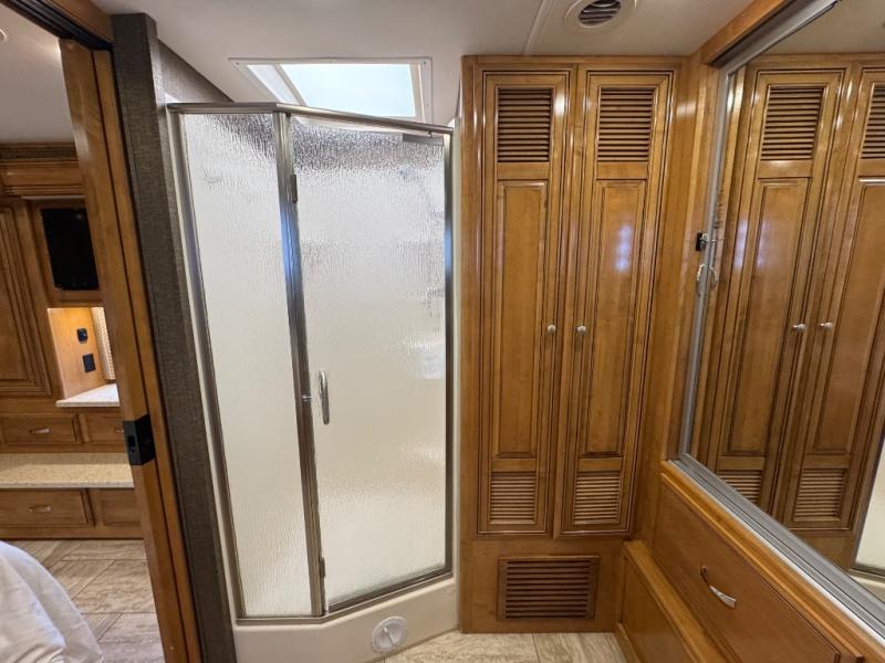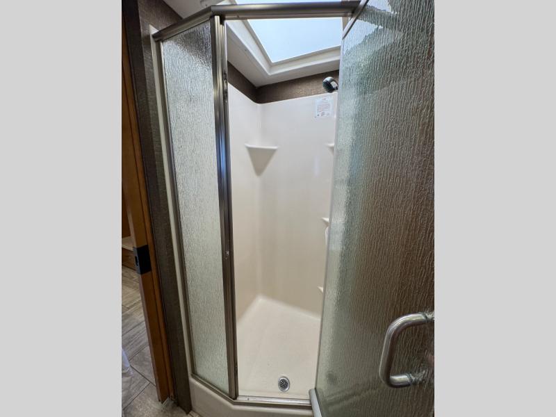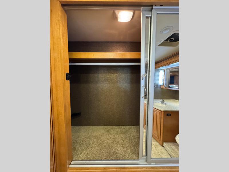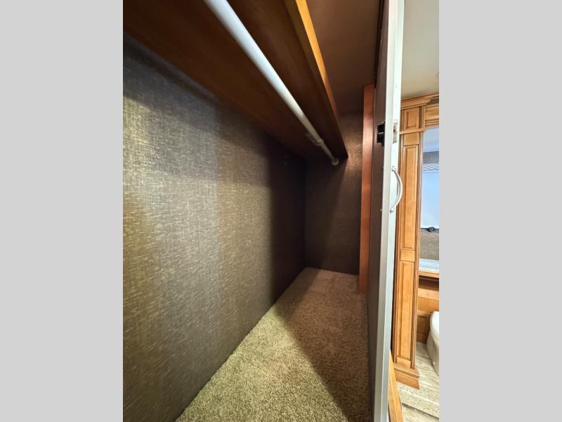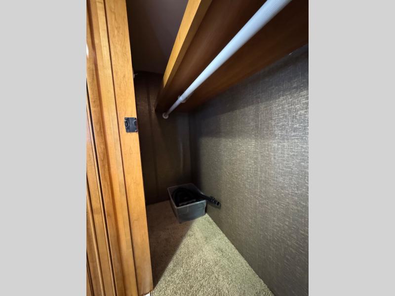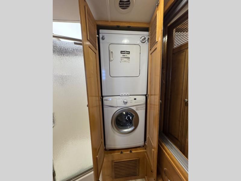 The rear bath features a 34" x 34" shower, washer and dryer, toilet, sink with overhead cabinet, and a large full wall wardrobe for all of your things.