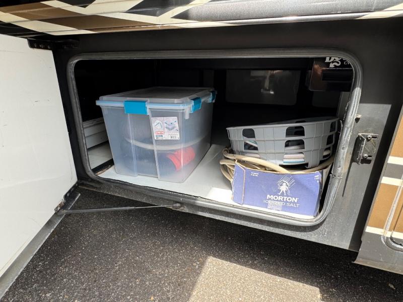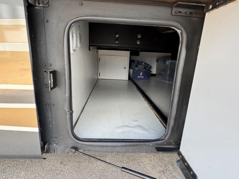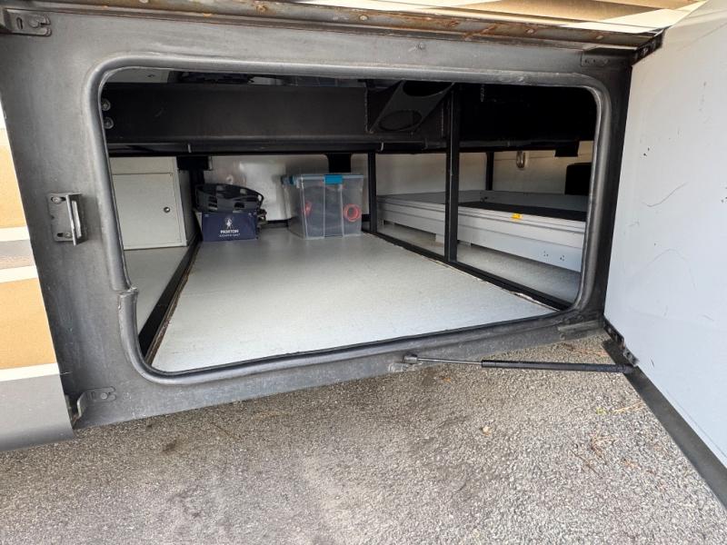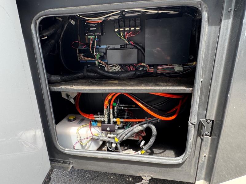 On the opposite side of the motor home there is a sofa with air bed which makes into a queen bed sleeping space and also a retractable 60" LED smart HDTV above. This slide also includes a dining table with four chairs and buffet. Nearby there is a 40" LED TV next to the dinette that can easily be seen from any seating in the space.