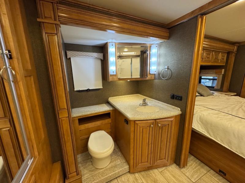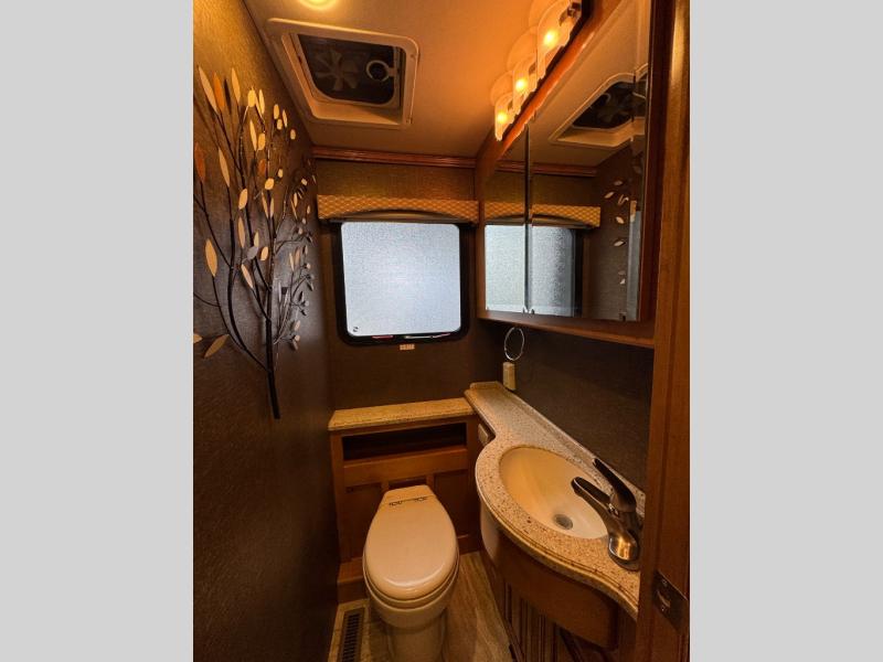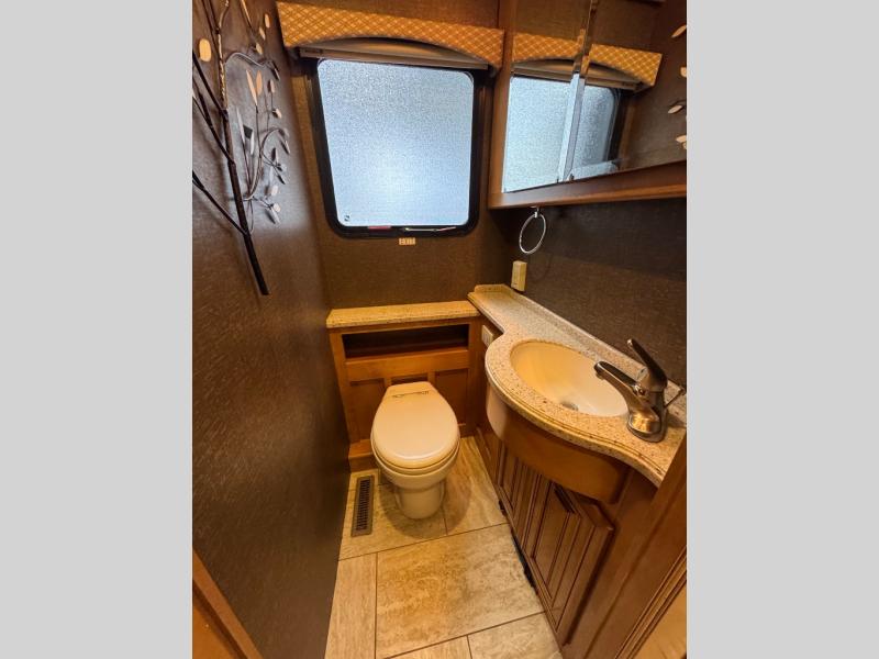 In the center of the coach find a convenient half bath along the road side that includes a toilet, sink, plus overhead cabinet.