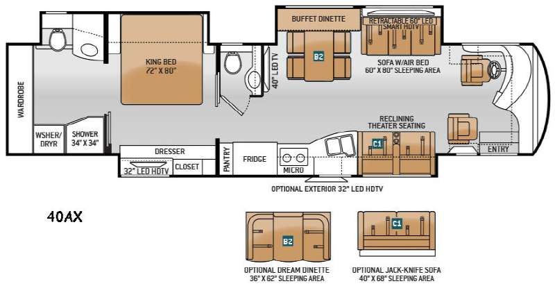 Choose the optional dream booth dinette with 32" x 62" sleeping area, and/or jack-knife sofa with 40" x 68" sleeping space in place of the dining table with four chairs and sofa with air bed that comes standard, plus so much more!