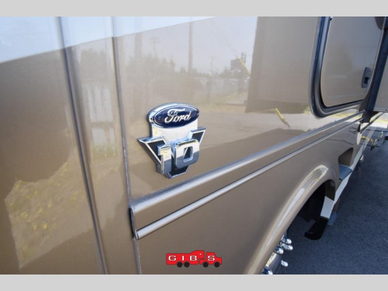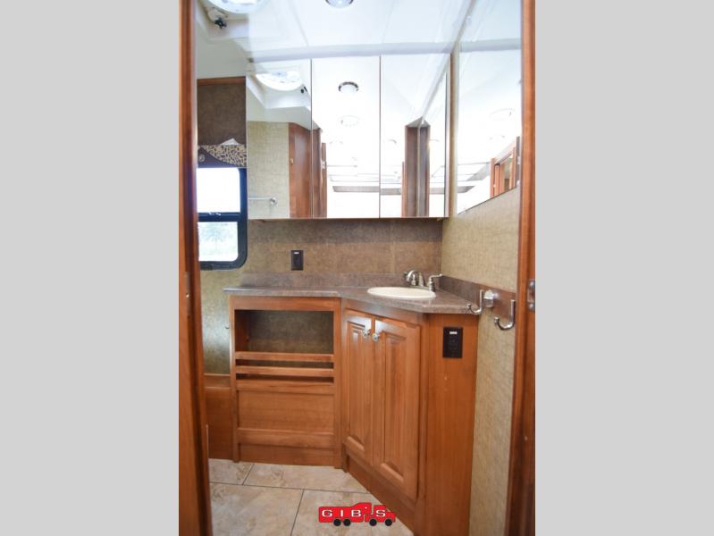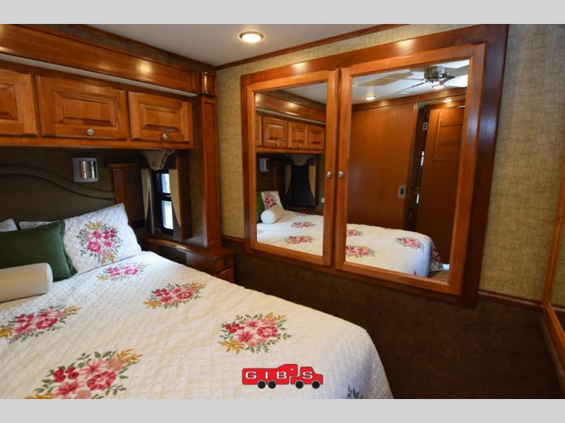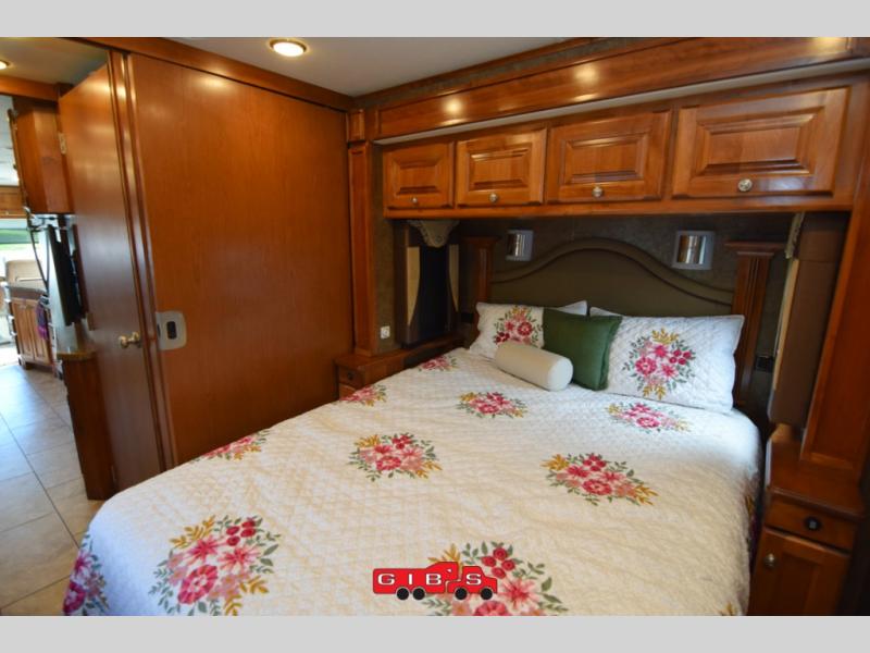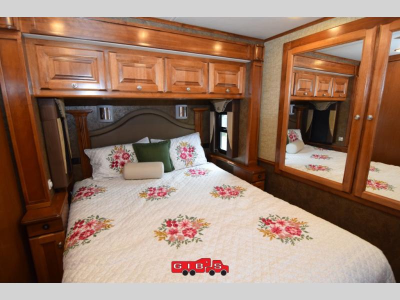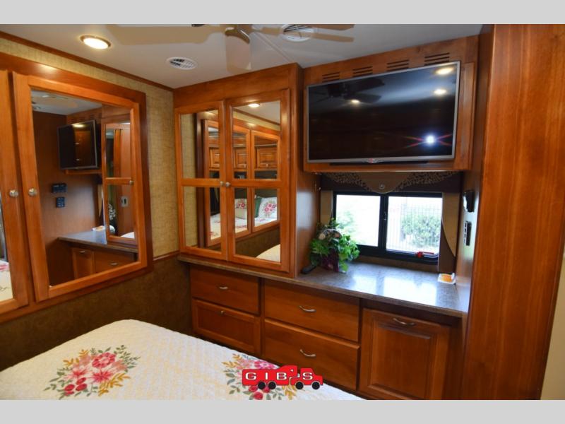 The rear bedroom has a slide with a queen bed that has nightstands at each side and overhead cabinets above the head of the bed. The rear wall of the coach features a large storage area, while the wall opposite the bed features a wardrobe with drawers below, and a vanity with a TV above it.