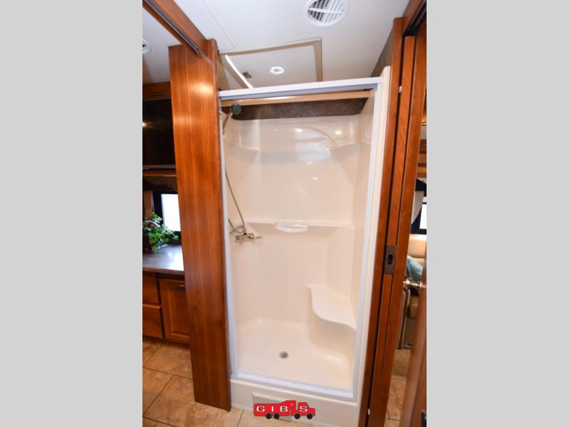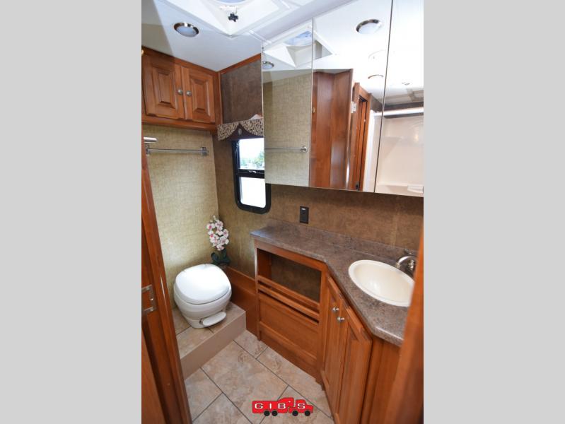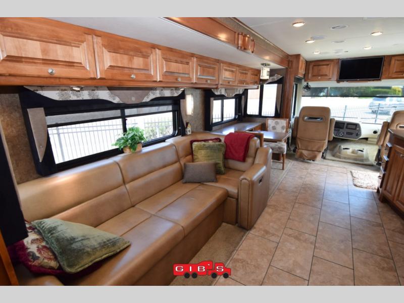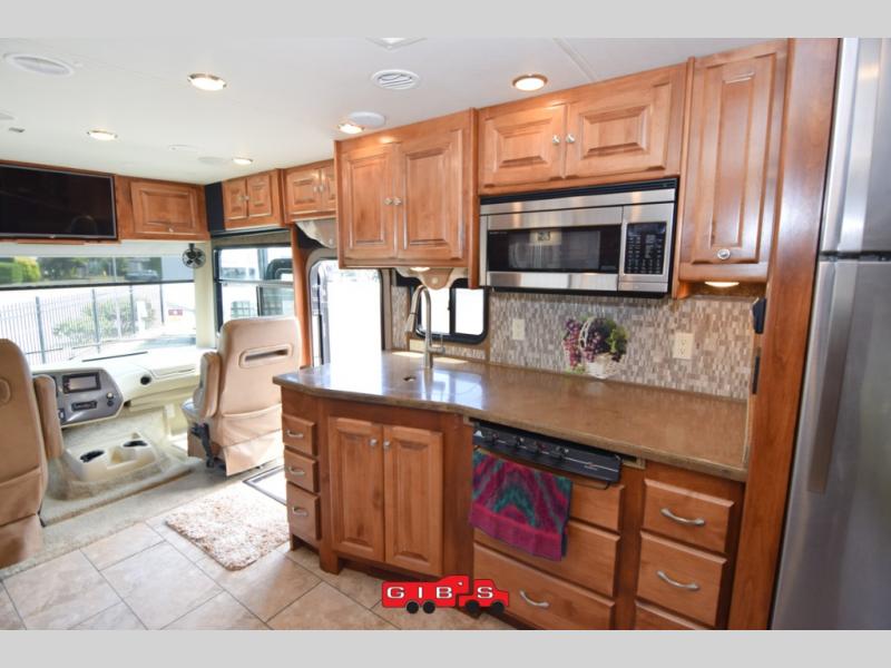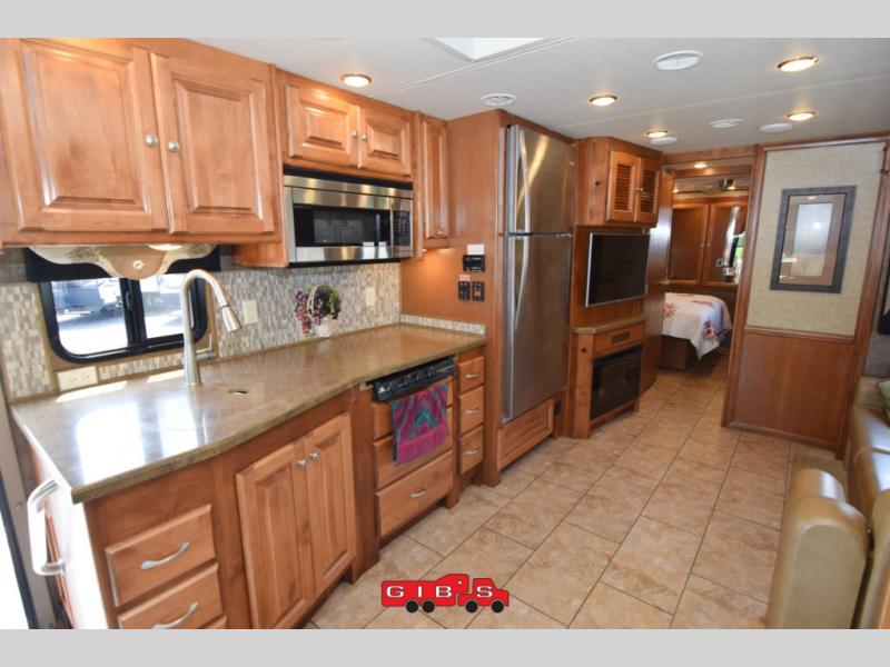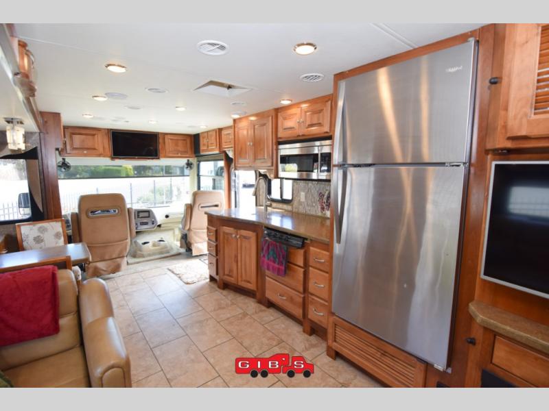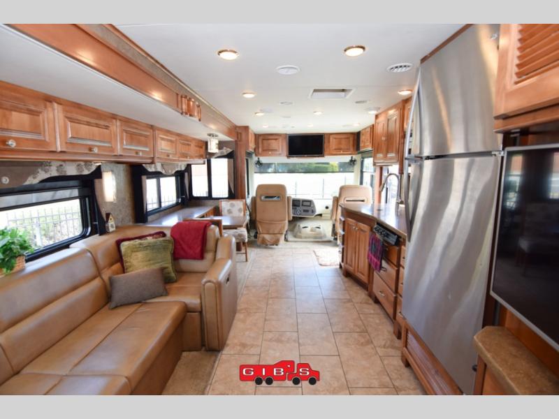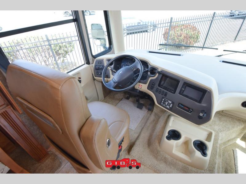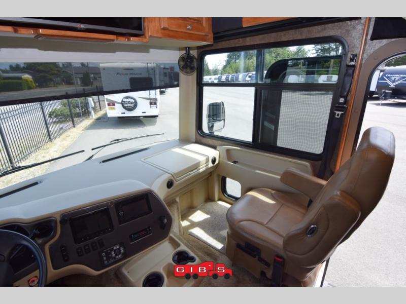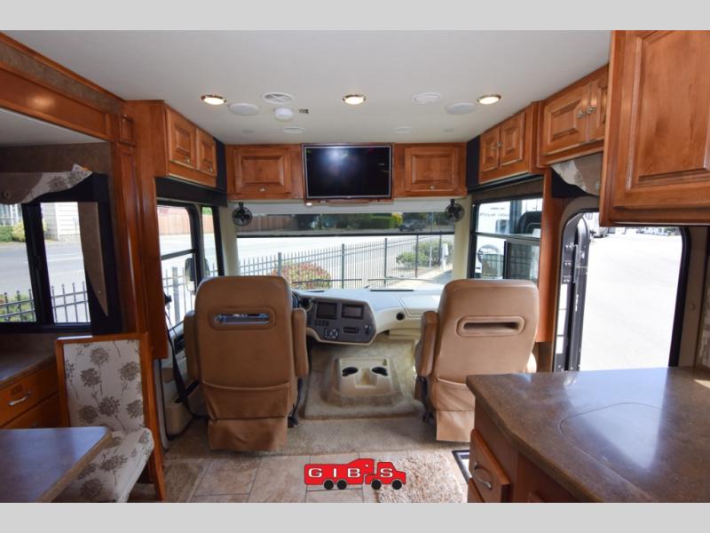 As you enter the coach, the front includes two captain's chairs, overhead cabinets at each side, an optional TV at the center front and an optional driver side door.