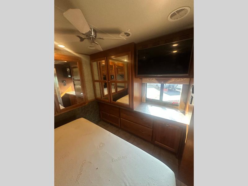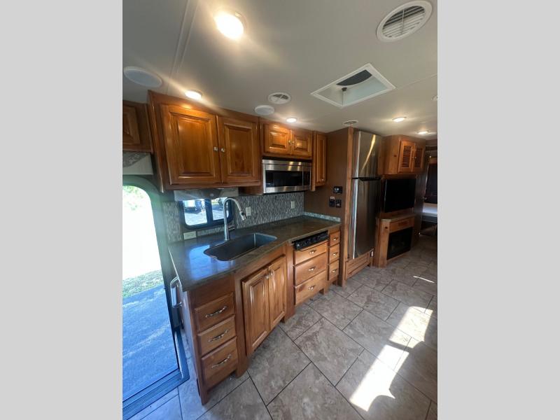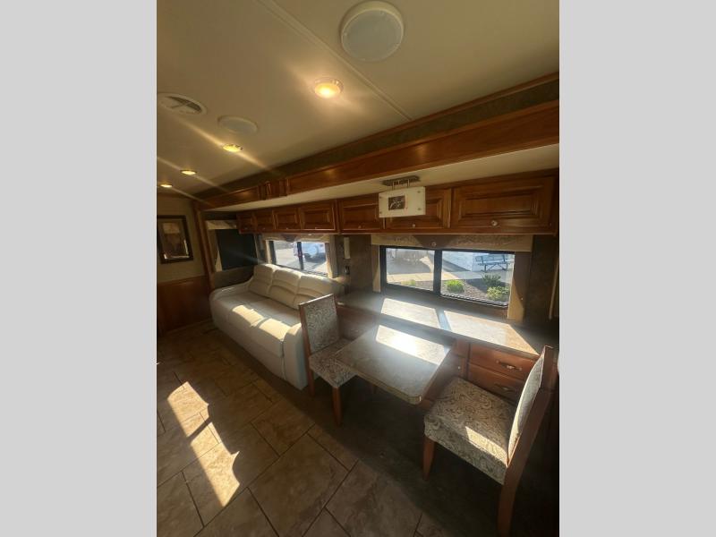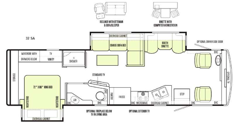 You can opt. for a fireplace below the living room TV, and also for an exterior TV as well. For furniture, you can swap out the chaise sofa sleeper for a recliner with ottoman and sofa sleeper, and the booth dinette can be exchanged for a dinette with computer workstation.